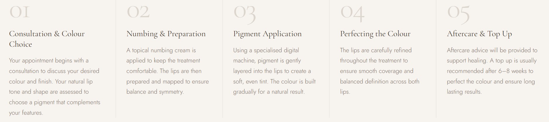 Every lip blush treatment at LT Brow Studio follows the same careful, considered process so you know exactly what to expect from start to finish.